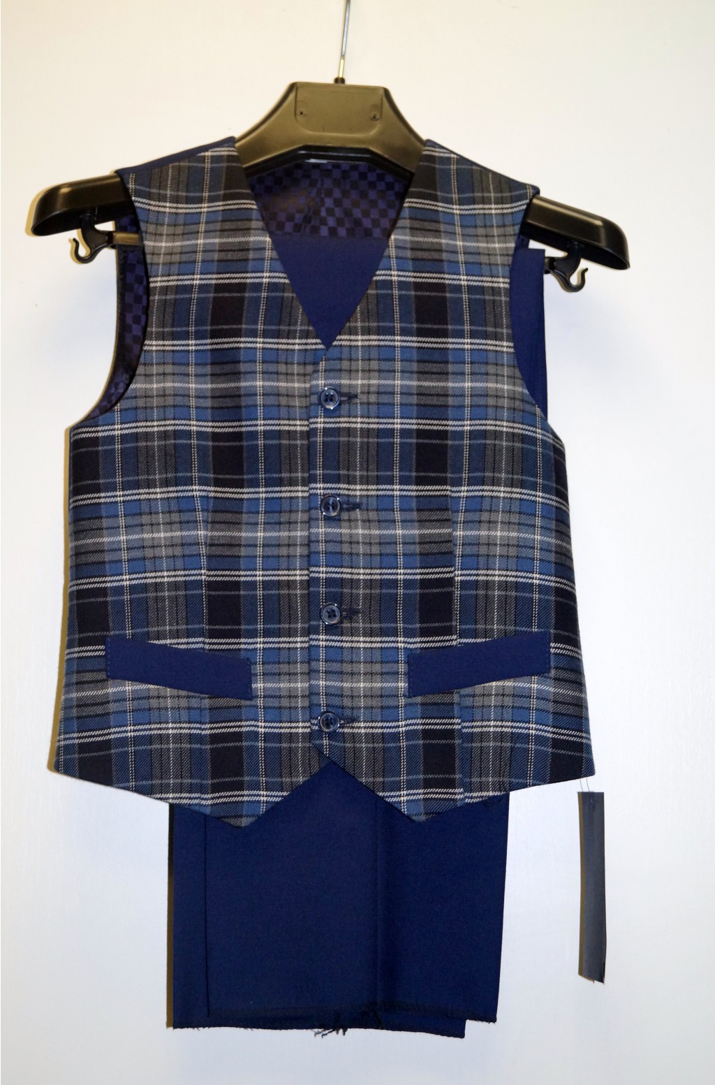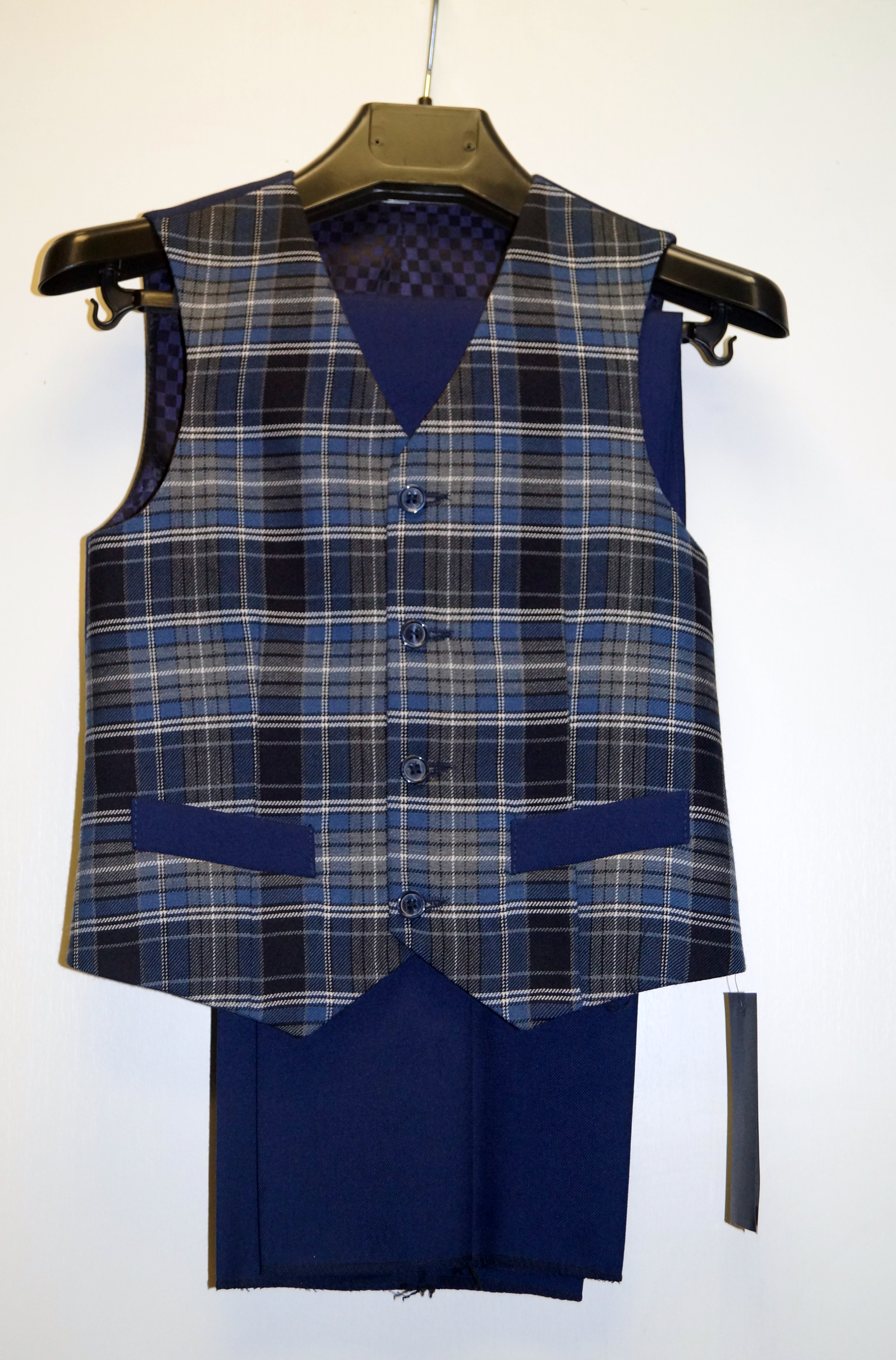 Костюм для мальчика начальных классов . Брюки с поясом на эластичной резинке для регулирования объема талии и карманами в боковом шве, умеренного объема. Длина брюк не подогнута, но с большим запасом. Жилет прямого силуэта на пуговицах.