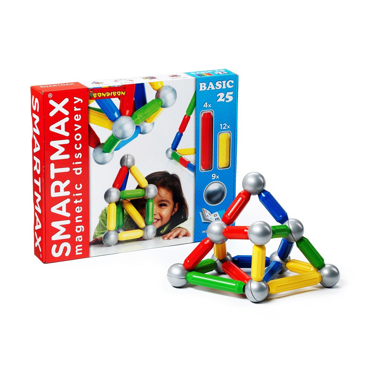 Этот базовый набор деталей SMARTMAX состоит из 25 магнитных элементов: 16 палочек и 9 шариков, которые дают огромный простор для фантазий и экспериментов ребенка. Этот конструктор безопасен даже для самых маленьких детей, так как его детали имеют сечение более трех сантиметров, а зачит малыш не сможет их проглотить или вдохнуть. Также детали конструктора невозможно разбить или разобрать на мелкие элементы, ведь при производстве используется технология ультразвуковой сварки, что делает все детали супер-крепкими.