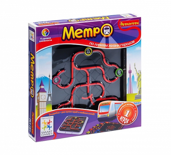 Ты сможешь создать собственный метрополитен в твоем любимом городе, и тебе не придется копать для этого землю. Расположи детали железнодорожной колеи на игровом поле таким образом, чтобы поезд метро смог проследовать через все станции, указанные в карточке с заданием. Схема движения поездов в метро разрабатывается с учетом определенных правил. Назови станции, как тебе захочется и не сбейся с маршрута! В игре 64 захватывающих логических задания, от самого простого до высшего уровня. Удобная игровая доска с отделением для хранения карточек с заданиями и правил игры. Идеальная дорожная игра для детей и взрослых, играть в которую можно и в автомобиле, и в метро, и на поезде, и на природе!