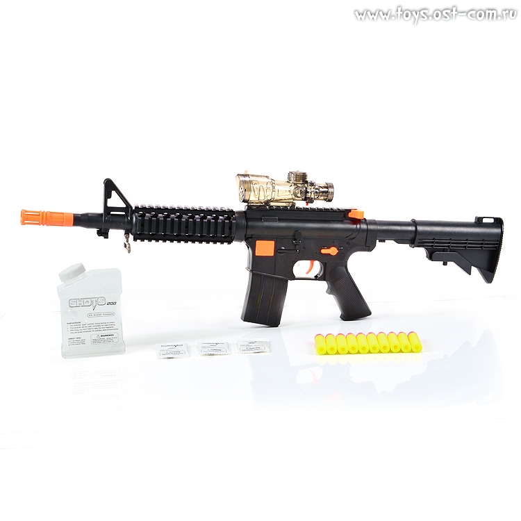 Автомат М67 стреляет шариками из водного полимера и пульками-присосками! Дополнительно оборудован яркой подсветкой. Выполнен
