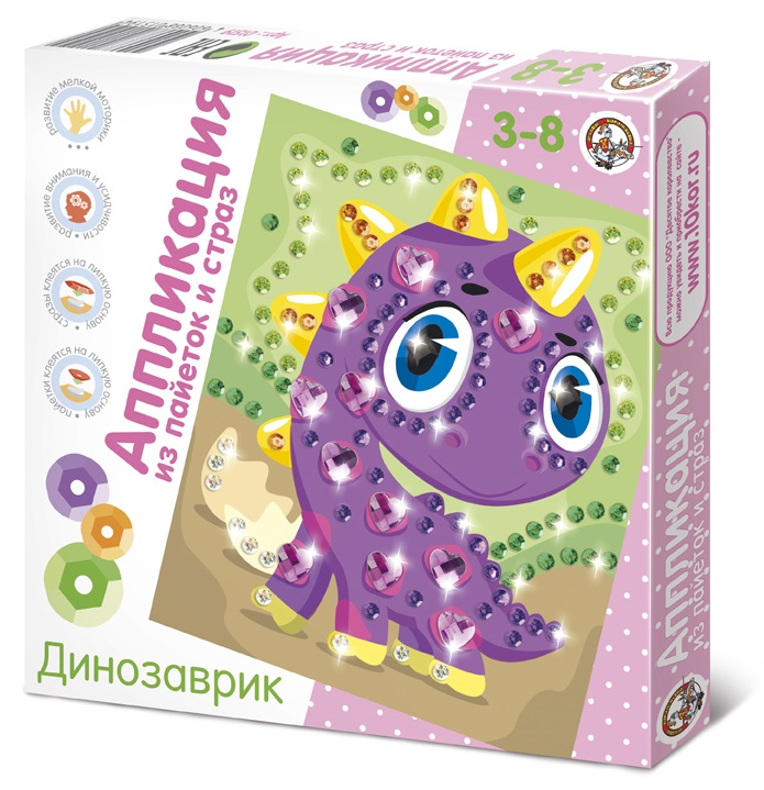 В комплекте: пайетки 5 цветов, стразы 3-х видов, картонная основа с изображением, самоклеящиеся кружочки из вспененного полимерного материала.