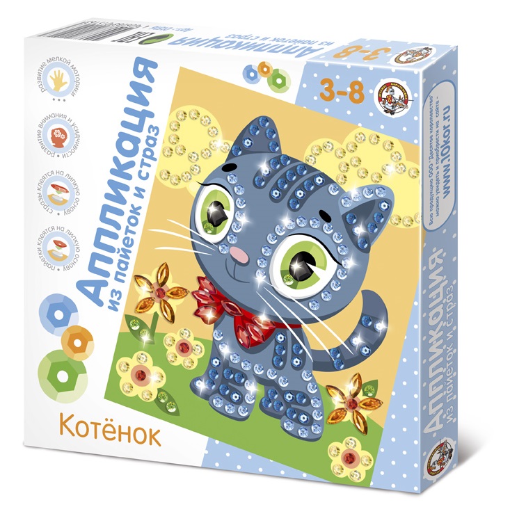 В комплекте: паетки 5 цветов, стразы 3-х видов, картонная основа с изображением, самоклеящиеся кружочки из вспененного полимерного материала.