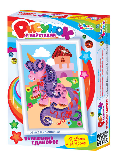 В набор входит 168 пайеток 4 цветов, по уровню сложности рисунок подходит детям, начиная с трех лет. Прикалывая паетки к планшету, ребенок развивает мелкие моторные движения и концентрацию внимания.
