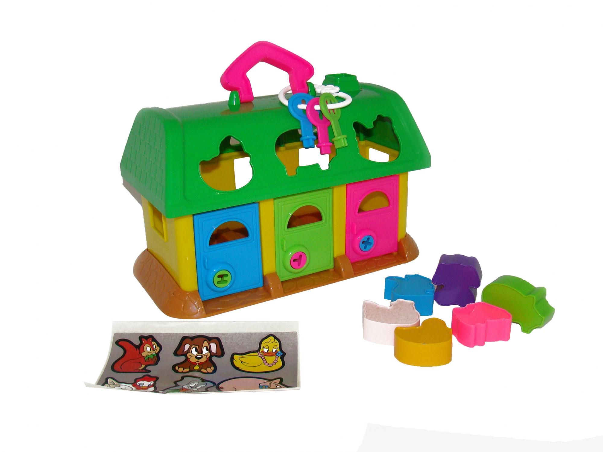 На крыше яркого домика, выполненного из безопасного пластика, сделаны 6 отверстий, соответствующих по форме одной из шести фигурок: поросенка, уточки, курочки, белочки, зайчика и собачки. В комплекте для каждой из них имеются яркие наклейки. Перед игрой желательно помочь ребенку их наклеить. На дверках - замки, которые открываются ключиками из набора. Если малыш сразу не сообразит, что дверки нужно открывать ключами, вставьте подходящий ключик в дверь, но не поворачивайте, вскоре ребенок сам сообразит, как дальше действовать. Красочный сортер помогает развить логические навыки и усидчивость.