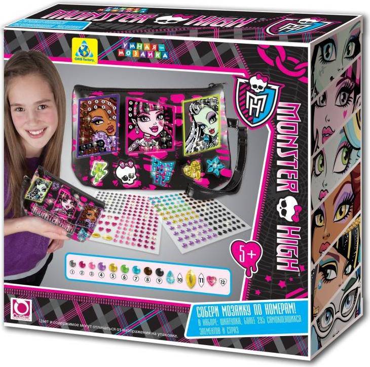 С набором мозаики от канадской компании Orb Factory девочка украсит черный клатч, входящий в комплект. Места для наклеивания пронумерованы, поэтому со сборкой мозаики справятся дети с пяти лет. В итоге, у крошки получится стильный клатч с изображением экстравагантных невероятно популярных куколок Монстр Хай. С такой модной сумочкой можно пойти на самую крутую вечеринку!