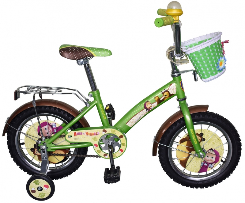 Это детское транспортное средство представляет собой двухколесный велосипед от торговой марки Navigator. Кроме двух основных колес, имеется и пара страховочных, что особенно удобно, если ребенок только учится самостоятельно ездить. Диски на колесах, а также рама детского транспорта украшены яркими изображениями персонажей мультсериала "Маша и Медведь", что вдохновит ребенка на проведение активного досуга.