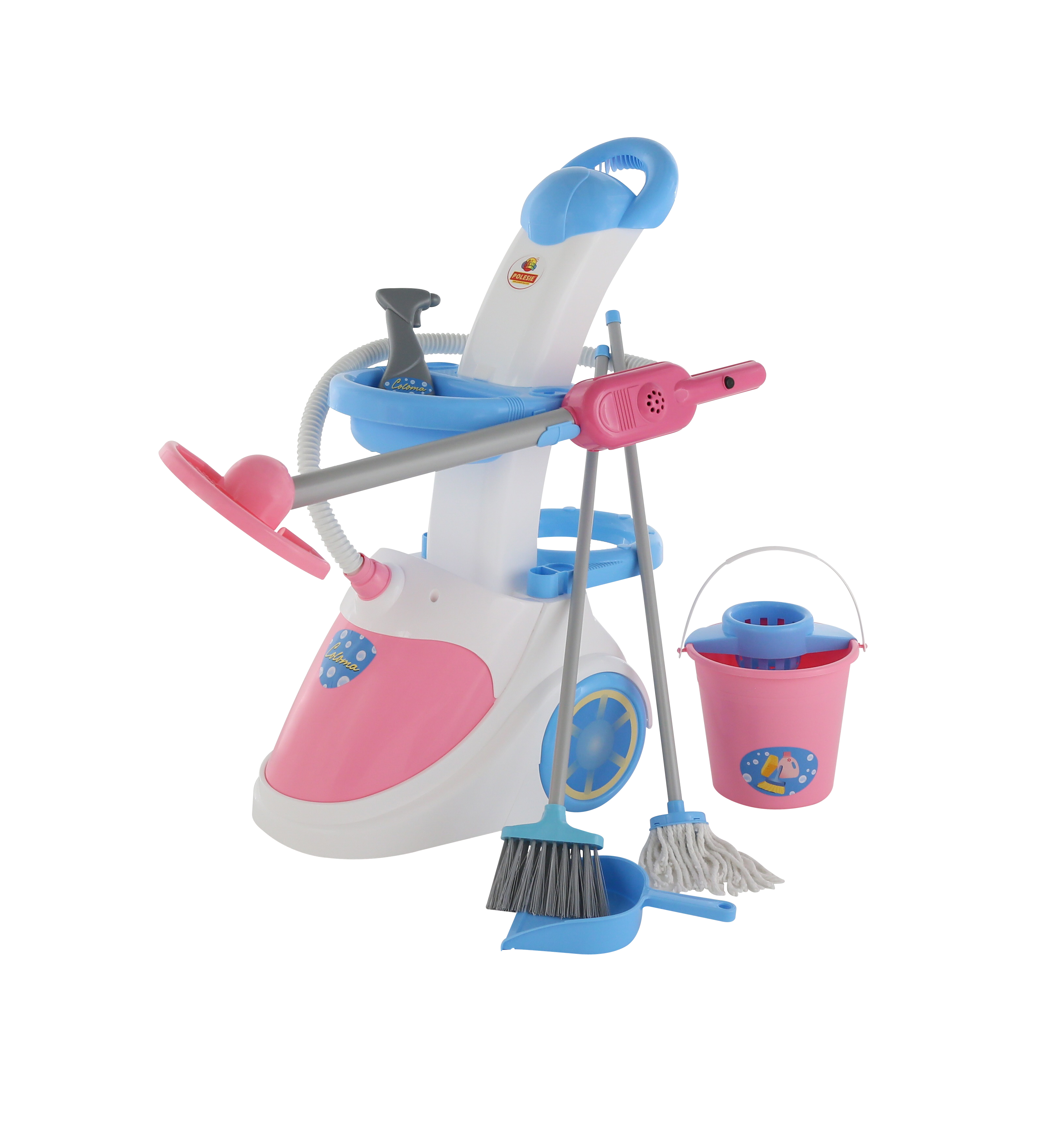 В наборе на тележке ведерко с отжимом, швабра, щетка и совок. А также флакон, имитирующий чистящее средство.