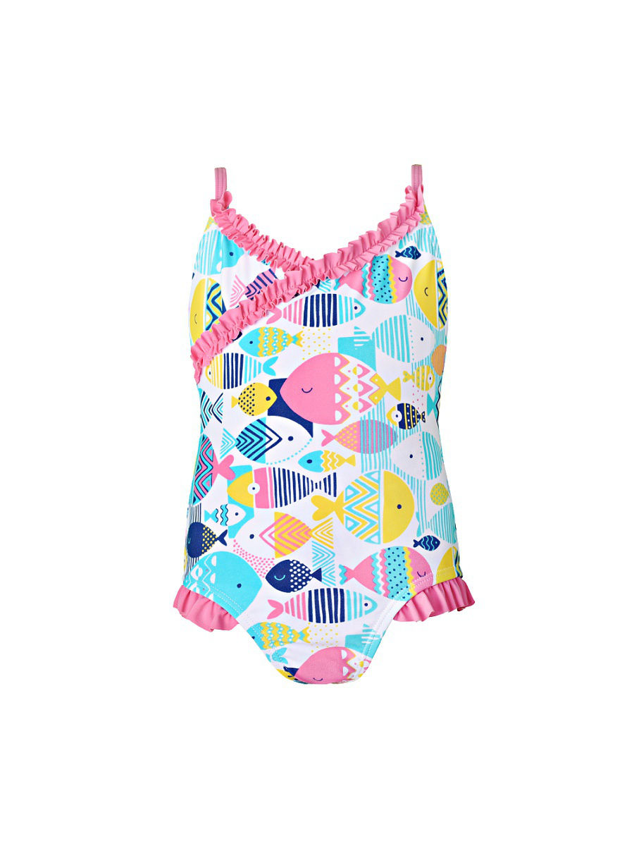 Состав: 80% нейлон, 20% спандекс. Купальник закрытый для девочки на тонких бретелях, из эластичного трикотажного полотна с набивкой, вырез углом и наклонный подрез на переде украшены узкой рюшей, по бокам внизу притачаны небольшие оборки. Бретели, рюши и оборка выполнены из однотоного полотна. Передняя часть изделия на подкладке, в горловину, пройму и нижние срезы вставлена эластичная тесьма.